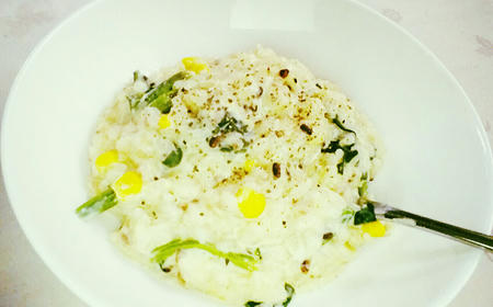 ・ホウレンソウとコーンとチーズの豆乳リゾット(お米は雑穀米)