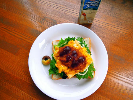 ・ レタス・スクランブルエッグ・チェダーチーズ・カツのオープンサンド