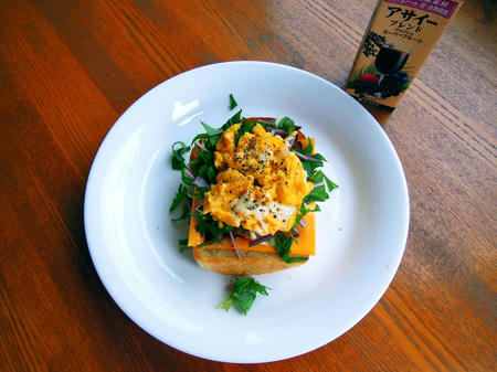 ・チェダーチーズ・スクランブルエッグ・ベビーリーフのオープンサンド