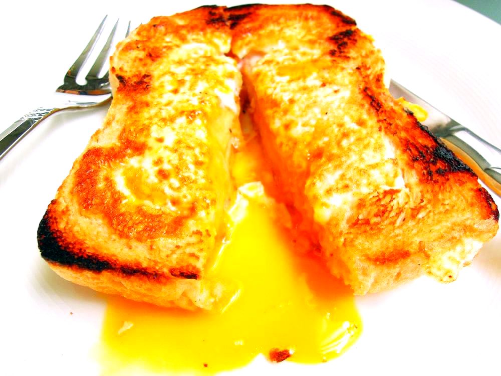 半熟目玉焼きとハム、チーズ入りのトースト