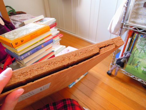 それで、いつも通り本棚に足をかけたら棚板がバキッといってしまいました。