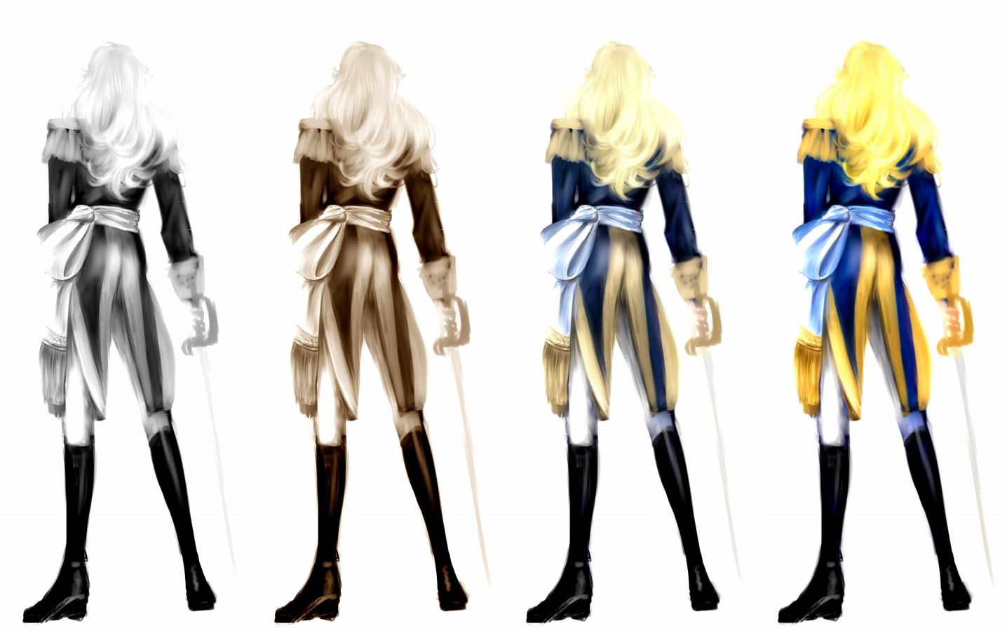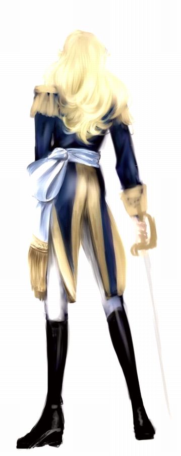 彼女の後ろ姿がすごく好きで、腰に巻いたリボン?(いや、帯?腰帯??腰ひも???何て言ったらいいんだろう?)とか、テイルコート型(?)のジャケットとか、髪のふわっとした感じとか、黒い乗馬ブーツとか、深いブルーとゴールドと白の組み合わせとか、もうこれ何フェチですか??